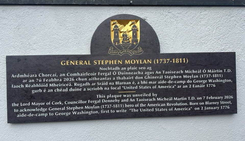Cork has given fitting recognition to one of its most distinguished native sons with the unveiling of a plaque on Blarney Street in honour of Stephen Moylan, the Cork-born Revolutionary figure whose life helped connect Ireland to the birth of the United States. The ceremony, held February 7, brought together civic leaders, community members, and supporters of Irish-American heritage to celebrate a man whose story speaks powerfully to the shared history of both nations.